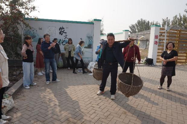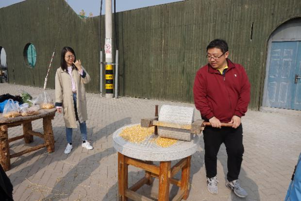 随后老师们还体验了“挑山工”、“磨玉米”等农活游戏。大多数老师平日里鲜有机会接触农活,没有挑扁担、转石磨的经历。大家参与热情高涨,认真学习如何才能将玉米磨得更细腻更均匀,体会劳动收获的乐趣。