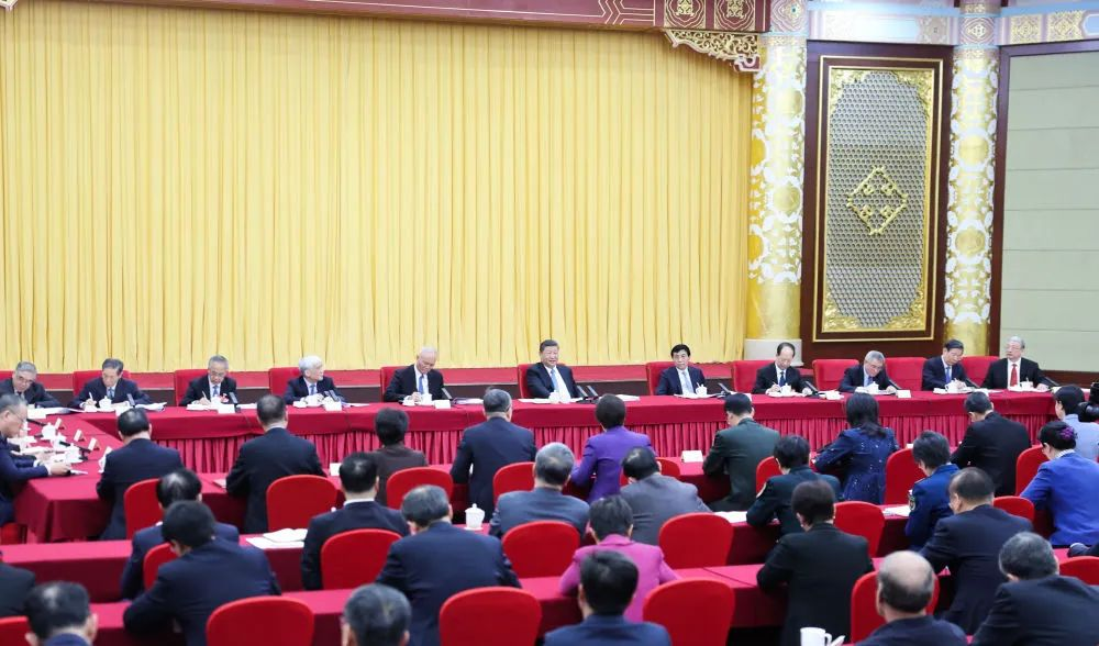 中共中央政治局常委、全国政协主席王沪宁,中共中央政治局常委、中央办公厅主任蔡奇参加看望和讨论。
