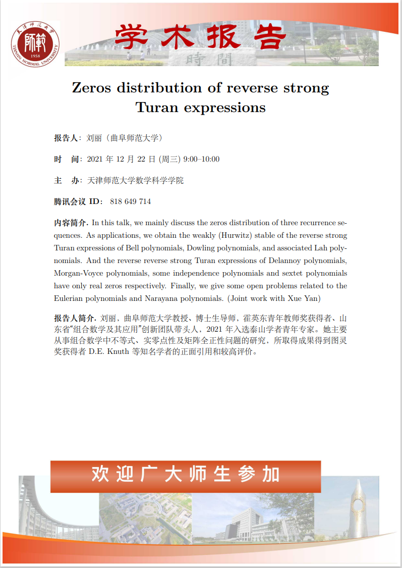 【预告】学术报告(2021-31)12月22日报告——Zeros distribution of reverse strong Turan expression