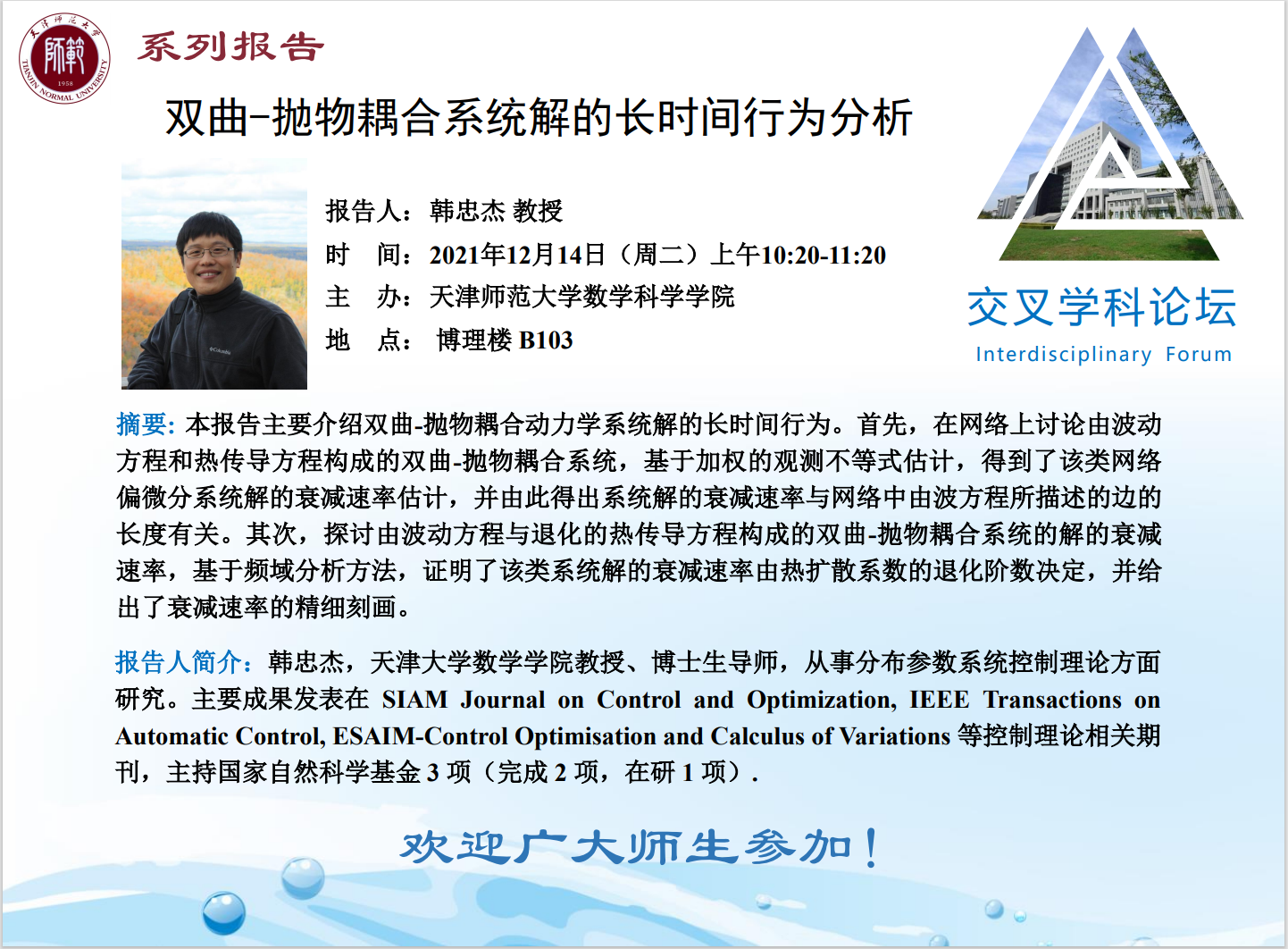【预告】学术报告(2021-32)12月14日报告——双曲-抛物耦合系统解的长时间行为分析