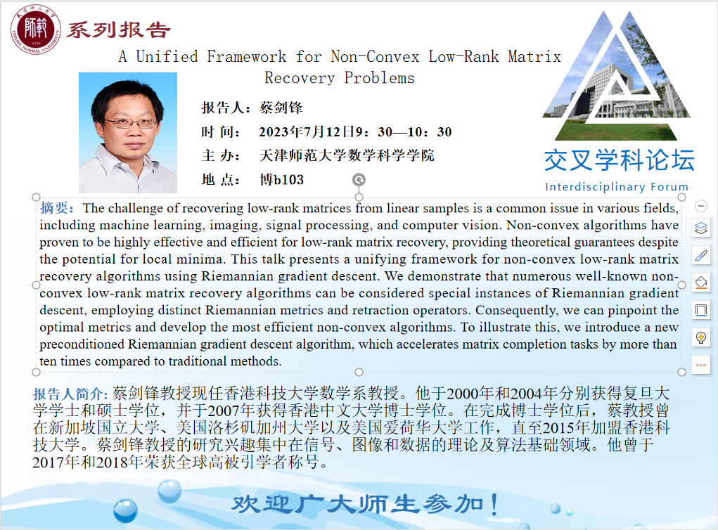 【预告】学术报告(2023-20)7月12日——A Unified Framework for Non-Convex Low-Rank Matrix Recovery Problems