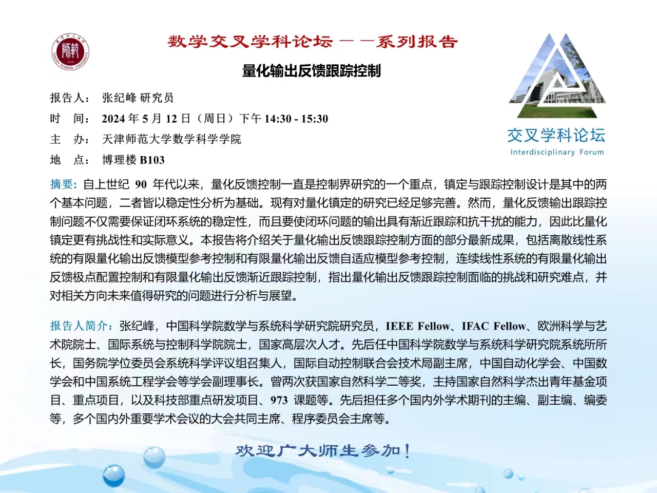 【预告】学术报告(2024-10)5月12日——量化输出反馈跟踪控制