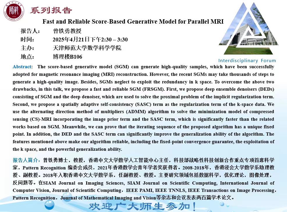 【预告】学术报告(2025-13)4月21日——Fast and Reliable Score-Based Generative Model for Parallel MRI