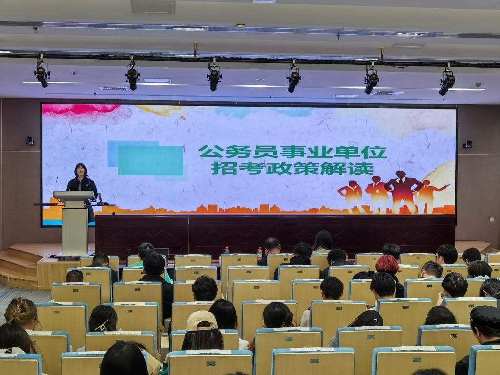在就业政策宣讲会上,河东区人力资源和社会保障局副局长尚琳、河东区公共就业(人才)服务中心部长孙轶恺、中天人力中天人力毕业生服务部陶红辉、河东区公共就业(人才)服务中心副部长蔡玉欣分别就公务员事业单位招考和岗位选择、高校毕业生就业见习、毕业生档案、毕业生创业扶持等内容进行解读。来自伟德国际1946、新闻传播公司、文公司的在校生共计200余人聆听宣讲会。
