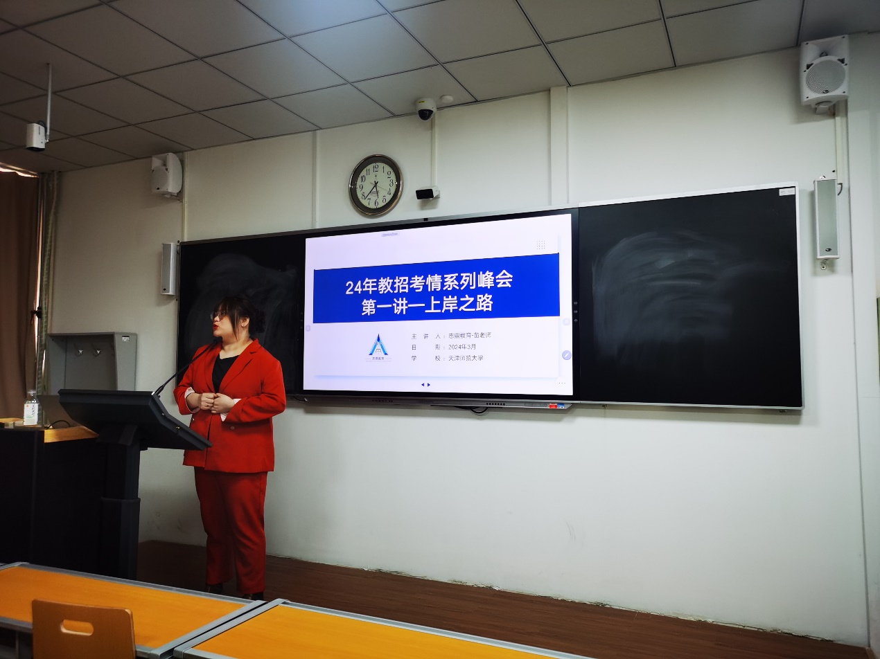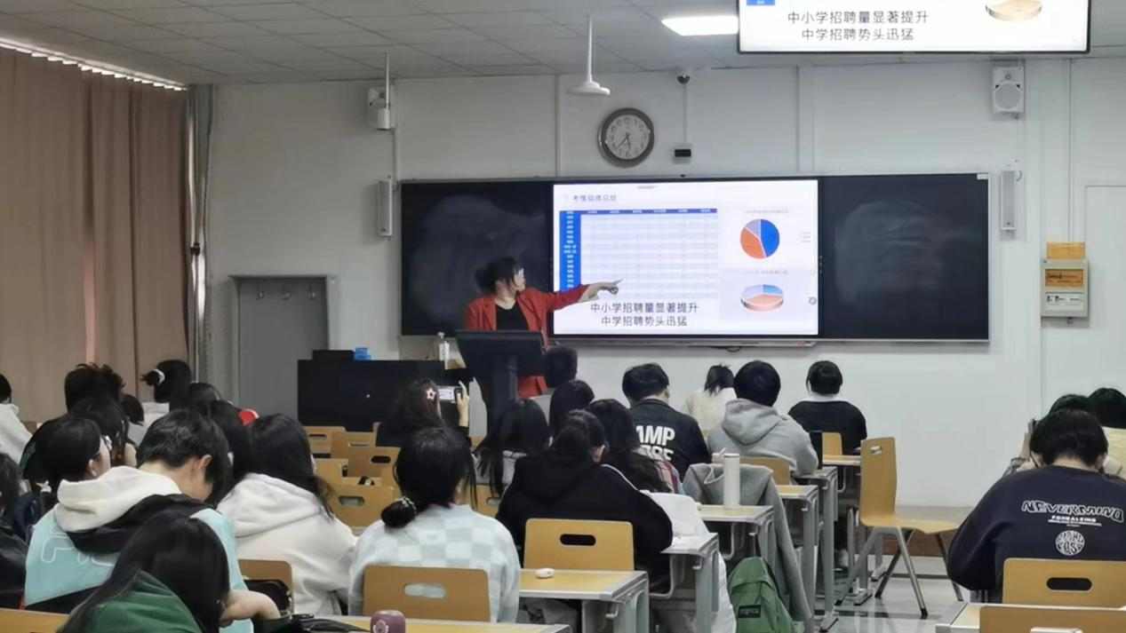 在讲座中,苗雯月老师围绕“2024年天津市教师编制考情”进行了深入剖析。她结合自己多年工作经验,综合分析了天津数学学科教师招聘考情规律及2024年教师招聘情况,向同学们分享了笔面复习策略。讲座中,苗老师与同学们积极交流互动,现场气氛十分活跃。